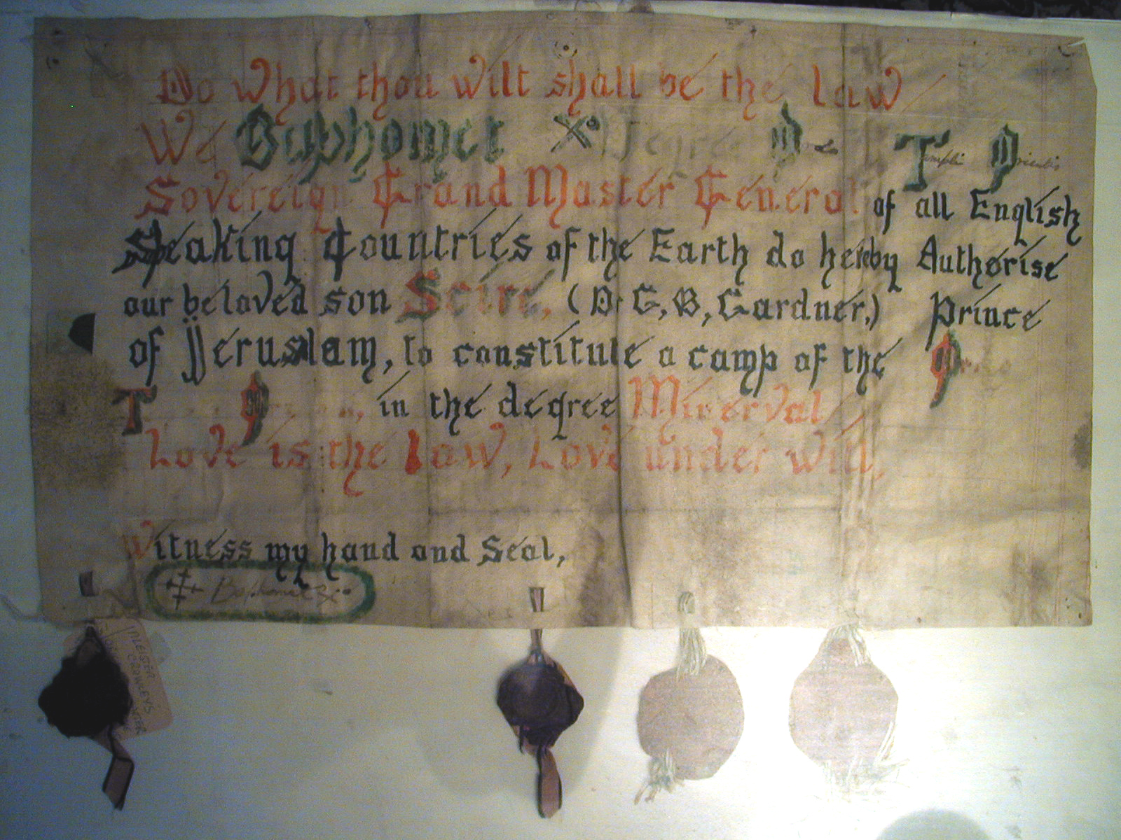 We Baphomet X° Ordo Templi Orientis Sovereign Grand Master General of all English Speaking Countries of the Earth do hereby Authorise our beloved son Scire, (Dr. G. B. Gardner,) Prince of Jerusalem, to constitute a camp of the Ordo Templi Orientis in the degree of Minerval