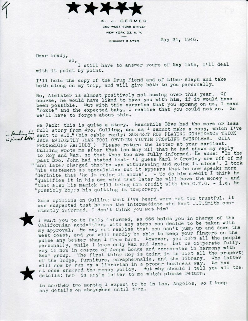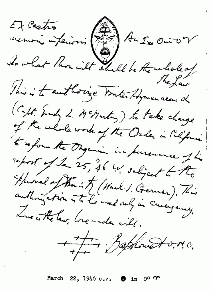 This is authorize Frater Hymenaeus A (Capt. Grady L Mc Murty) to take charge of the whole of the order in California. To reform the organisation in pursuence of his report of Jan 25, ’46 e.v. subject to the approval of Frater Saturnus (Karl J Germer) . This authorization is to be used only in emergency. Love is the law etc. Baphomet. OHO.
