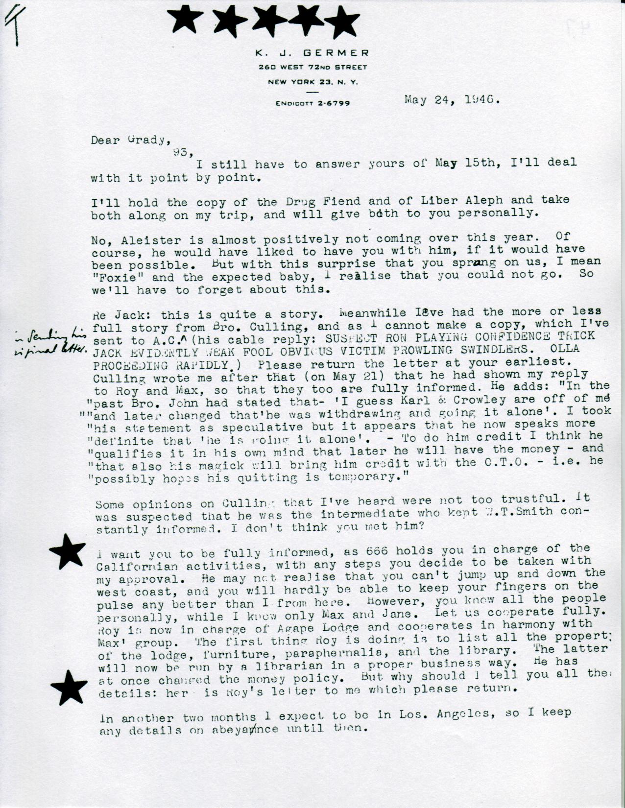 - Received a letter from Crowley naming him as a possible successor to Germer.