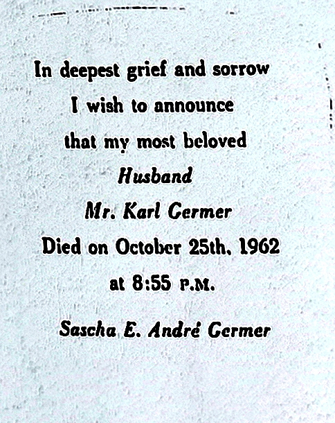 2) Mrs.Germer decided – without asking for my opinion in this important matter pertaining to “this part of the Will”, nor contacting me at all – to accept Herr Metzger’s strange “Manifesto” (printed this spring) as gospel truth and to recognise him as “Grand Master X° of the Order and Sovereign Grand Master General”(sic!). Neither Mrs. Germer, nor Herr Metzger (who for the last six years had regularly treated me with mailing me his pamphlets, which shows that he well knew my address) notified me before March 28th 1963 of Karl Germer’s death (on October 25th, 1963) [sic, should be 1962], nor his sham “election” on Jan 6th 1963. My questions regarding Metzger’s authority to assume the above titles and his right to call a “convocation of Prince Patriarchs” to the village of Stein, Switzerland, for his “election” were never answered by either Mrs. Germer nor Metzger. Nor could I obtain an explanation about negotiations carried on between the two during the five months before they contacted me. They have thereby decidedly violated (and not “executed” as the Petition states) the Will of the deceased.