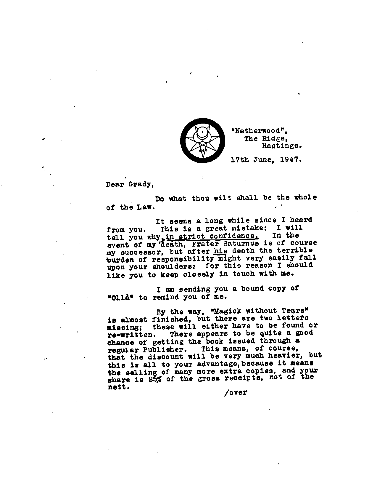 It seems a long while since I heard from you. This is a great mistake: I will tell you why in strict confidence. In the event of my death, Frater Saturnus is of course my successor, but after his death the terrible burden of responsibility might very easily fall upon your shoulders: for this reason I should like you to keep closely in touch with me.
