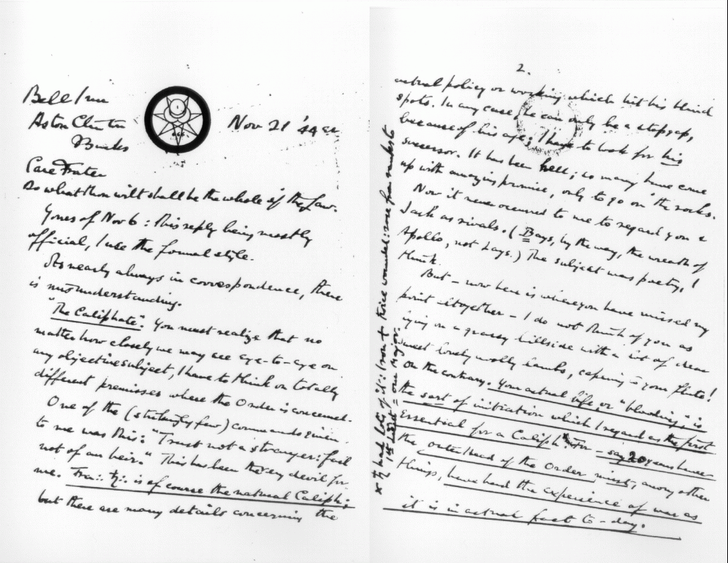 One of the (startling few) commands given to me was this: “Trust not a stranger: fail not of an heir.” This has been the very devil for me. Fr∴ [Saturnus] is, of course, the natural Caliph; but there are many details concerning the actual policy or working which hit his blind spots. In any case, he can only be a stopgap, because of his age; I have to look for his successor. It has been Hell; so many have come up with amazing promise, only to go on the rocks. …